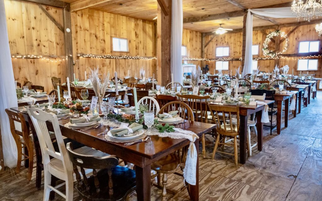 Cocktail hour can be held outdoors on the grounds or inside our second rustic barn, giving guests a comfortable space to gather while the reception barn is prepared. This second barn also serves as an indoor ceremony option in case of inclement weather, offering peace of mind without sacrificing the charm and character couples love.